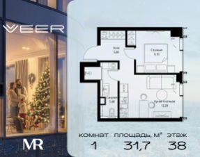 Продаётся 1-комнатная квартира общей площадью 31.70 м² без отделки в ЖК VEER на 38-м этаже 59 этажного дома.