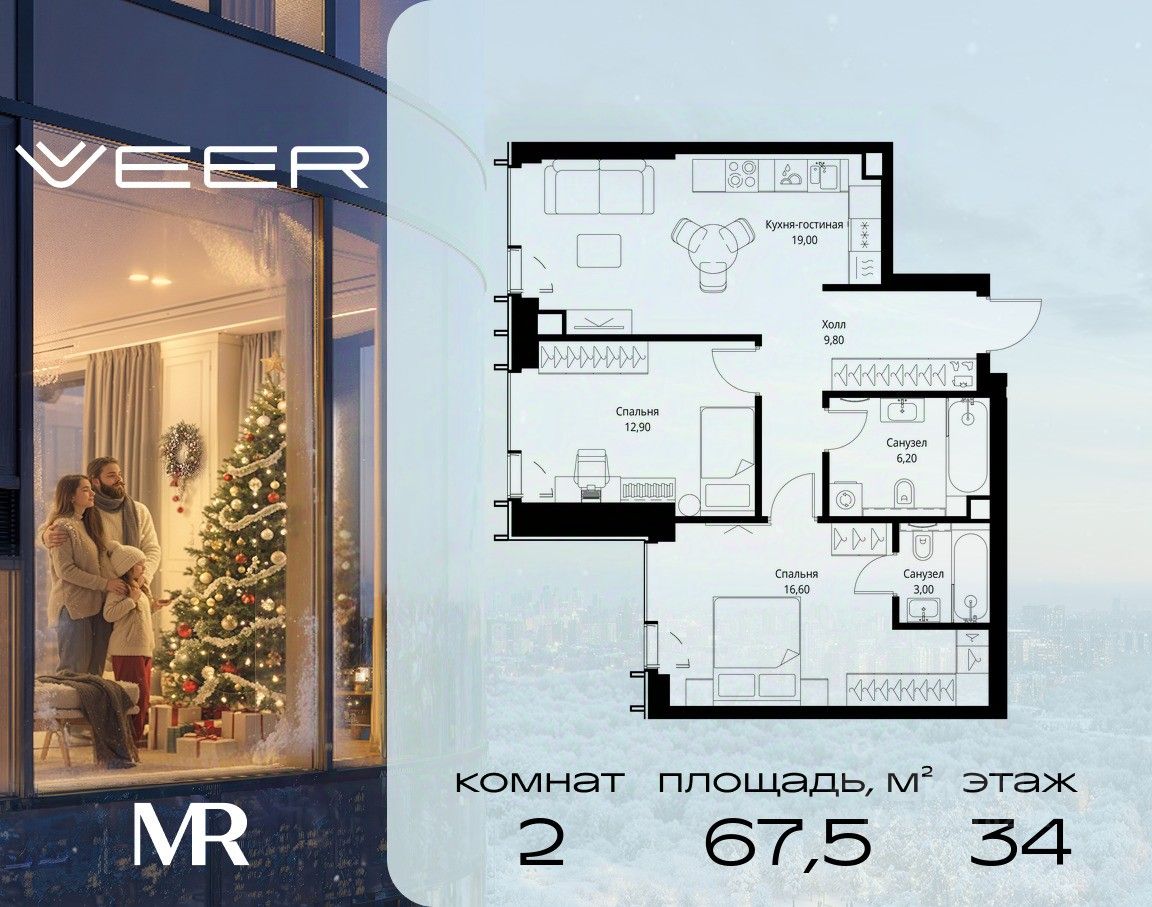 Продаётся 2-комнатная квартира общей площадью 67.50 м² без отделки в ЖК VEER на 34-м этаже 59 этажного дома.