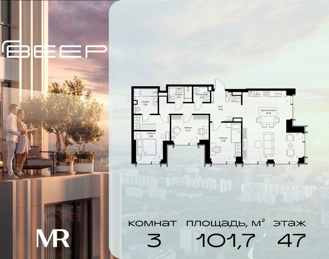 Продаётся 3-комнатная квартира общей площадью 101.70 м² без отделки в ЖК Веер на 47-м этаже 59 этажного дома.