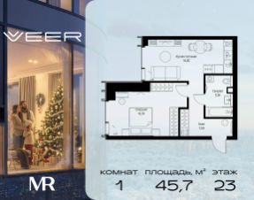 Продаётся 1-комнатная квартира общей площадью 45.70 м² без отделки в ЖК VEER на 23-м этаже 59 этажного дома.