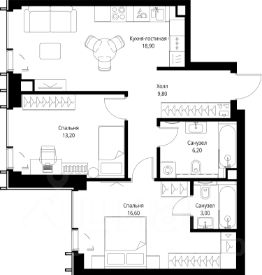 Продаётся 2-комнатная квартира общей площадью 67.70 м² без отделки в ЖК VEER на 44-м этаже 59 этажного дома.