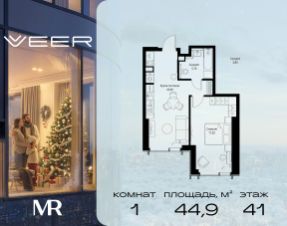 Продаётся 1-комнатная квартира общей площадью 44.90 м² без отделки в ЖК VEER на 41-м этаже 59 этажного дома.