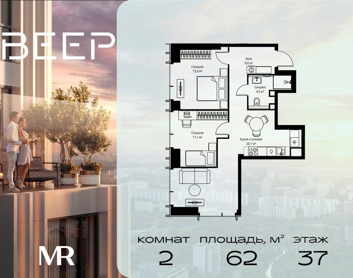 Продаётся 2-комнатная квартира общей площадью 62 м² без отделки в ЖК Веер на 37-м этаже 59 этажного дома.
