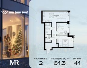 Продаётся 2-комнатная квартира общей площадью 61.30 м² без отделки в ЖК VEER на 41-м этаже 59 этажного дома.