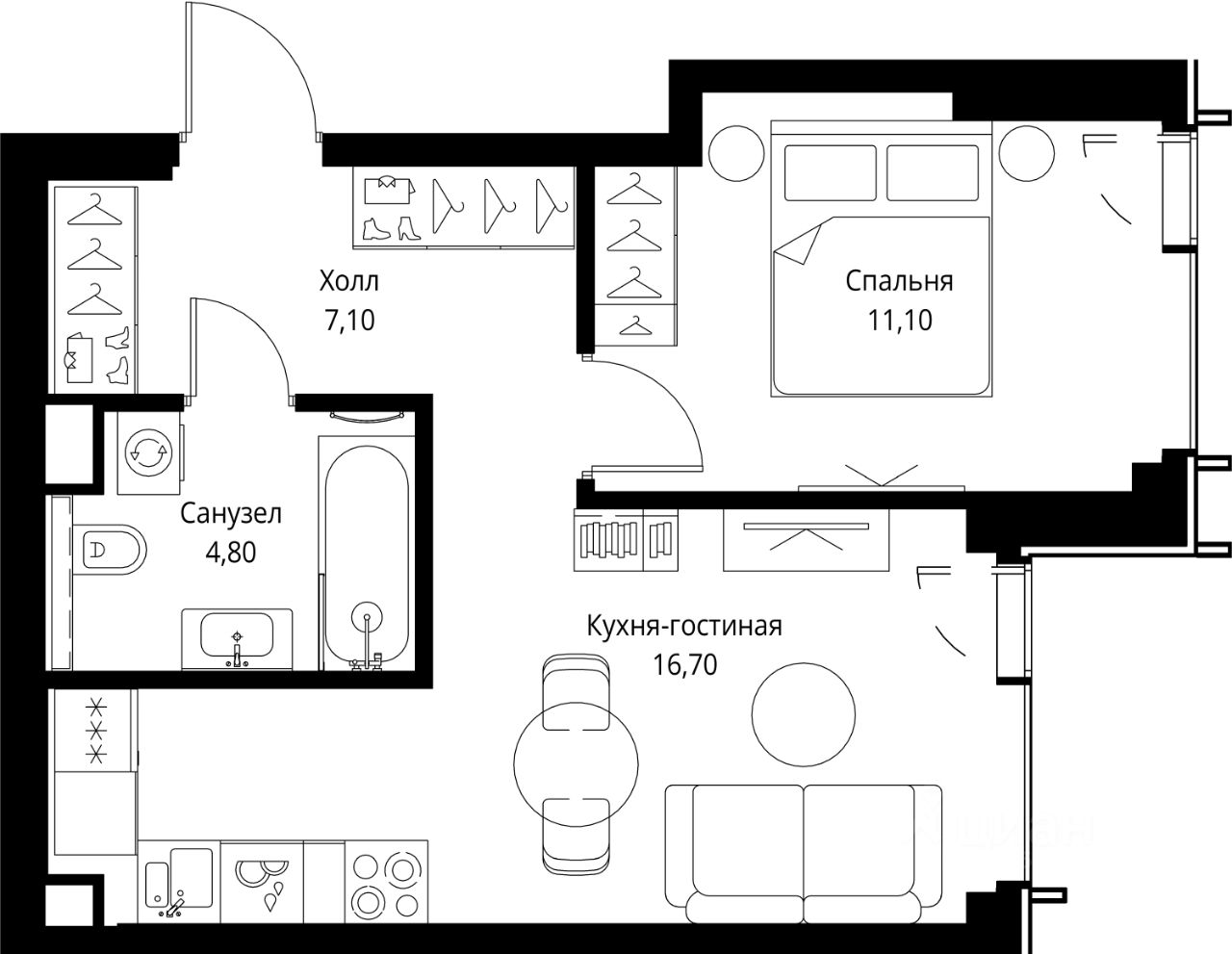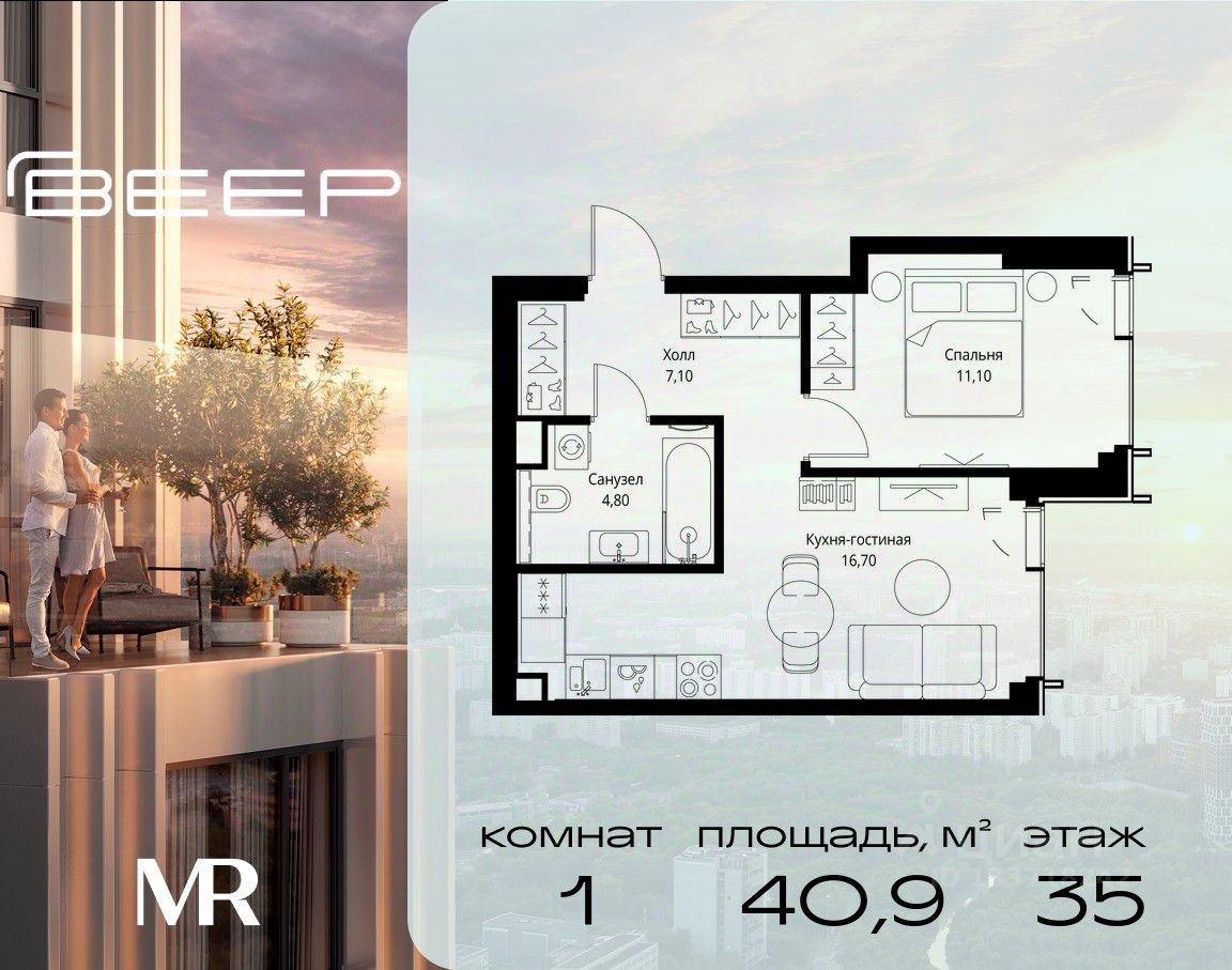 Продаётся 1-комнатная квартира общей площадью 40.90 м² без отделки в ЖК Веер на 35-м этаже 59 этажного дома.