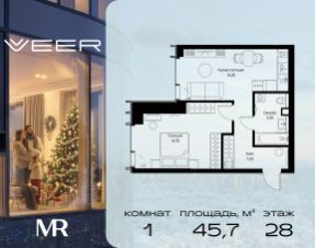 Продаётся 1-комнатная квартира общей площадью 45.70 м² без отделки в ЖК VEER на 28-м этаже 59 этажного дома.
