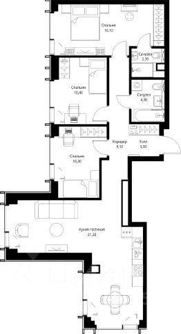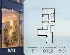 Продаётся 3-комнатная квартира общей площадью 87.20 м² без отделки в ЖК VEER на 50-м этаже 59 этажного дома.
