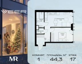 Продаётся 1-комнатная квартира общей площадью 44.30 м² без отделки в ЖК VEER на 17-м этаже 59 этажного дома.
