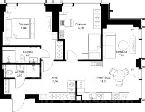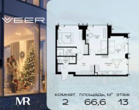Продаётся 2-комнатная квартира общей площадью 66.60 м² без отделки в ЖК VEER на 13-м этаже 59 этажного дома.