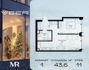 Продаётся 1-комнатная квартира общей площадью 43.60 м² без отделки в ЖК VEER на 11-м этаже 59 этажного дома.