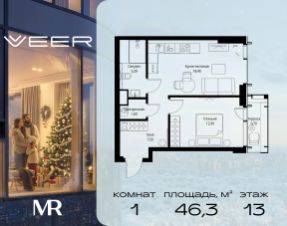 Продаётся 1-комнатная квартира общей площадью 46.30 м² без отделки в ЖК VEER на 13-м этаже 59 этажного дома.