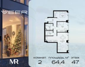 Продаётся 2-комнатная квартира общей площадью 64.40 м² без отделки в ЖК VEER на 47-м этаже 59 этажного дома.