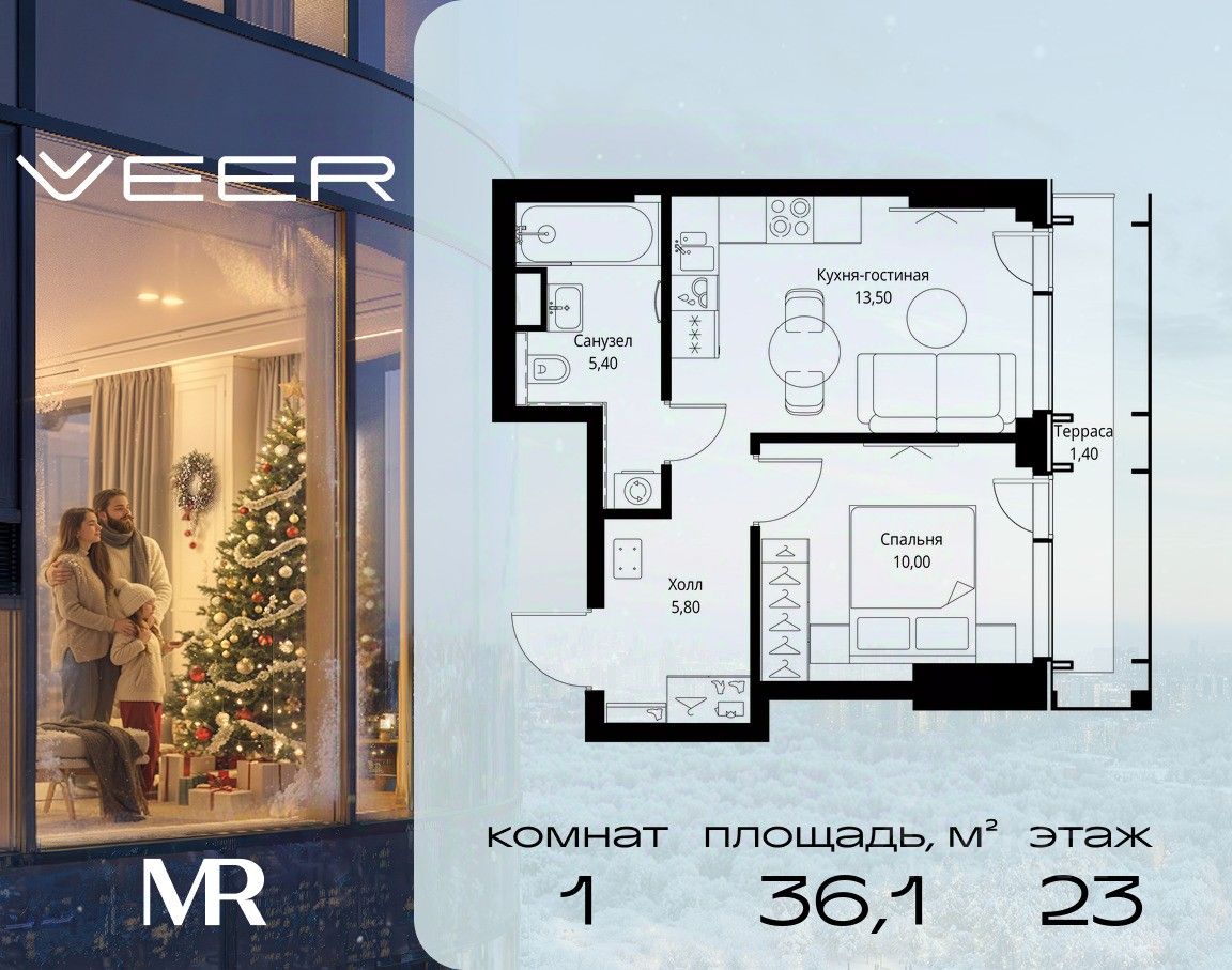Продаётся 1-комнатная квартира общей площадью 36.10 м² без отделки в ЖК VEER на 23-м этаже 59 этажного дома.