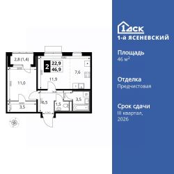 Продаётся 2-к квартира номер 461 общей площадью 46.9 кв.м. на 5-м этаже 18 этажного здания. Отделка Whitebox. Цена с учётом скидки.
