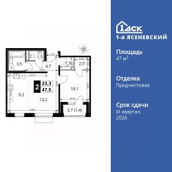 Продаётся 2-к квартира номер 490 общей площадью 47.5 кв.м. на 8-м этаже 18 этажного здания. Отделка Whitebox. Цена с учётом скидки.