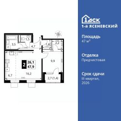 Продаётся 2-к квартира номер 231 общей площадью 47.9 кв.м. на 9-м этаже 18 этажного здания. Отделка Whitebox. Цена с учётом скидки.