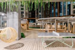 В ЖК продуманная, богатая инфраструктура из трех зон. В основной входной группе сконцентрированы все блага современного мегаполиса: супермаркет, ресторан, фитнес-клуб, аптеки, салоны красоты и кофейня. Под шумные детские игры отведен нижний уровень, мы предусмотрели игры как для самых ма