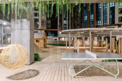 В ЖК продуманная, богатая инфраструктура из трех зон. В основной входной группе сконцентрированы все блага современного мегаполиса: супермаркет, ресторан, фитнес-клуб, аптеки, салоны красоты и кофейня. Под шумные детские игры отведен нижний уровень, мы предусмотрели игры как для самых маленьких, так и для деток постарше. Для досуга взрослых есть места для спорта, занятий йогой, шезлонги и деревянные террасы для отдыха.