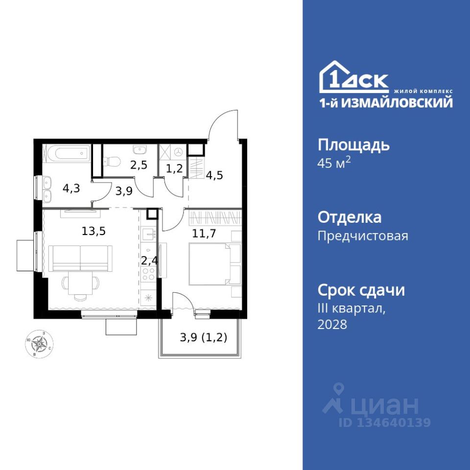 Продаётся 2-к квартира номер 1062 общей площадью 45.2 кв.м. на 19-м этаже 25 этажного здания. Отделка Whitebox. Цена с учётом скидки.