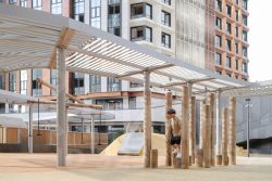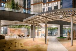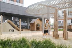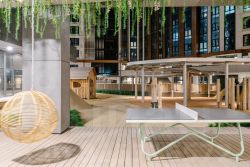 В ЖК продуманная, богатая инфраструктура из трех зон. В основной входной группе сконцентрированы все блага современного мегаполиса: супермаркет, ресторан, фитнес-клуб, аптеки, салоны красоты и кофейня. Под шумные детские игры отведен нижний уровень, мы предусмотрели игры как для самых маленьких, так и для деток постарше. Для досуга взрослых есть места для спорта, занятий йогой, шезлонги и деревянные террасы для отдыха.