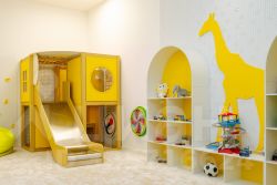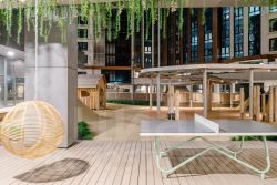 В ЖК продуманная, богатая инфраструктура из трех зон. В основной входной группе сконцентрированы все блага современного мегаполиса: супермаркет, ресторан, фитнес-клуб, аптеки, салоны красоты и кофейня. Под шумные детские игры отведен нижний уровень, мы предусмотрели игры как для самых маленьких, так и для деток постарше. Для досуга взрослых есть места для спорта, занятий йогой, шезлонги и деревянные террасы для отдыха.