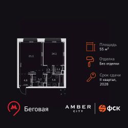 Продаётся 2-к квартира номер 1075 общей площадью 55.1 кв.м. на 35-м этаже 57 этажного здания. Без отделки. Цена с учётом скидки.