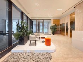 Ясные линии фасадов, натуральные материалы доломит, стекло и медь создают одновременно современный и уютный облик.