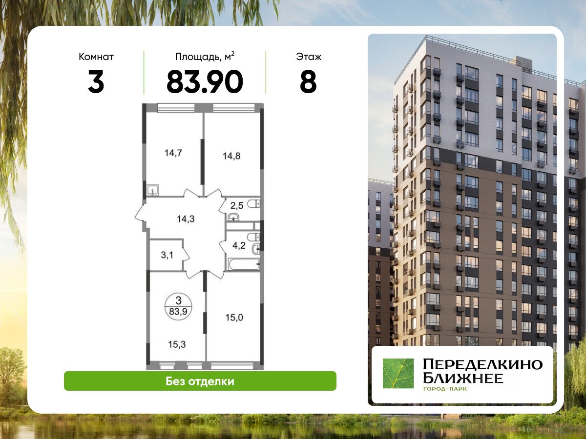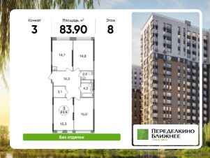 Общая площадь квартиры - 83,9 кв. м, этаж 8 из 17.
