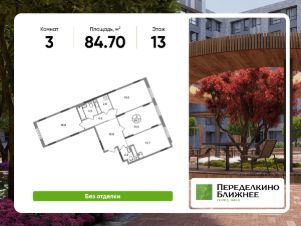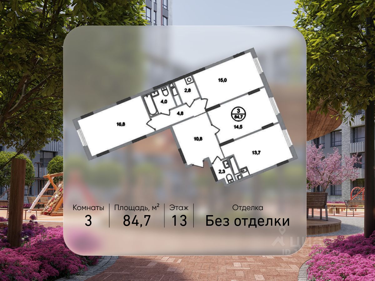 Общая площадь квартиры - 84,7 кв. м, этаж 13 из 17.