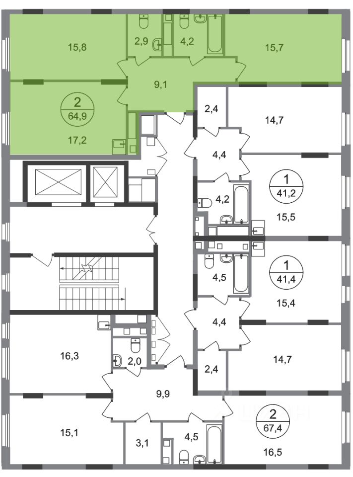 Общая площадь квартиры - 64,9 кв. м, этаж 7 из 17.