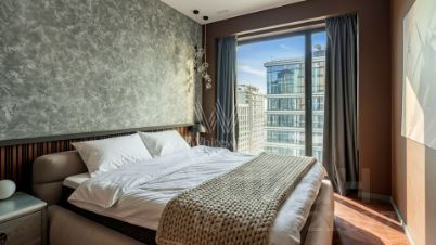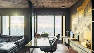 Видовая квартира с 2 спальнями общей площадью 90 м² в комплексе премиум-класса Prime Park с презентабельной входной группой от британского бюро Dyer. Квартира расположена на 31 этаже, откуда открываются панорамные виды на город и башни "Москва-Сити". Выполнена дизайнерская отделка по индивидуальному проекту. Интерьер оформлен в современном стиле с уклоном в авиацию.