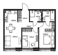 Планировка: Евро-3 (две изолированные комнаты)