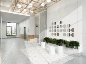 Входные группы с панорамным остеклением расположены на уровне земли: можно без усилий спуститься с коляской или велосипедом. Над дизайном лобби и подъездов работала мастерская "Балкон".