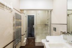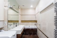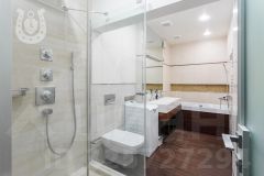 Совмещенный сан/узел в минималистичном светлом дизайне продолжающий концепцию всей квартиры. Установлена ванная, душевая и стиральная машина.