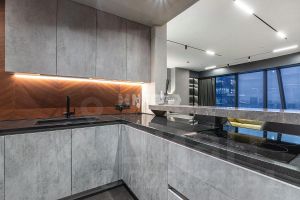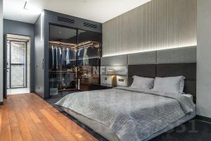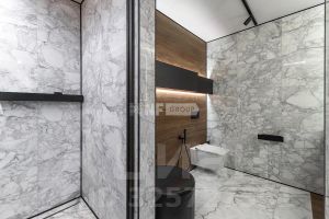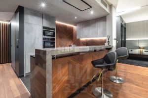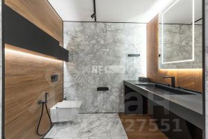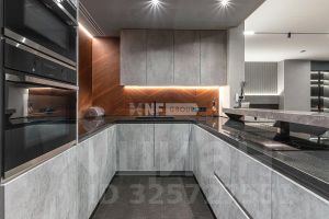 Интерьер выполнен в стиле современного городского люкса с чистыми линиями, архитектурным светом и панорамными окнами. В отделке использованы натуральный камень, алюминиевые рамы, шпон, декоративные панели и массив ореха.