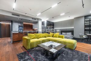 Планировка: просторная студия с кухонной зоной, зона спальни, гардеробная и постирочная, два санузла.