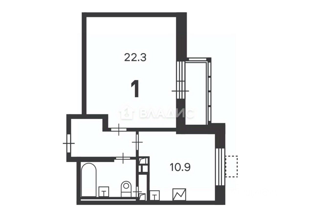 Однокомнатная квартира площадью 42,5 кв. м на втором этаже 22-этажного монолитного дома 2024 года постройки. Жилая площадь составляет 22 кв. м, кухня — 11 кв. м. Высота потолков 2,7 м.