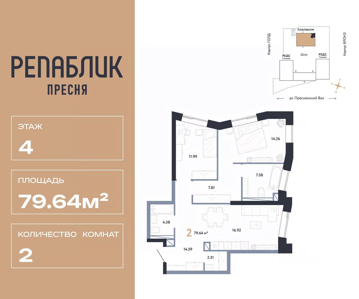 Продается 3комнатная квартира на 4 этаже от застройщика Страна Девелопмент. Площадь квартиры 79.64 кв. м.