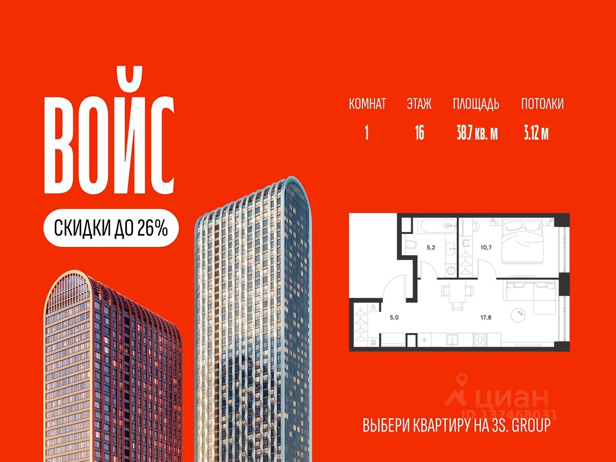 Продается уютная 1-комн. квартира площадью 38,7 кв.м на 16 этаже жилого комплекса бизнес-класса Войс. Общая площадь: 38,7 кв.м., жилая: 18,1 кв.м., площадь кухни-гостиной: 17,8 кв.м., высокие потолки: 3,12 м., санузел совмещенный.