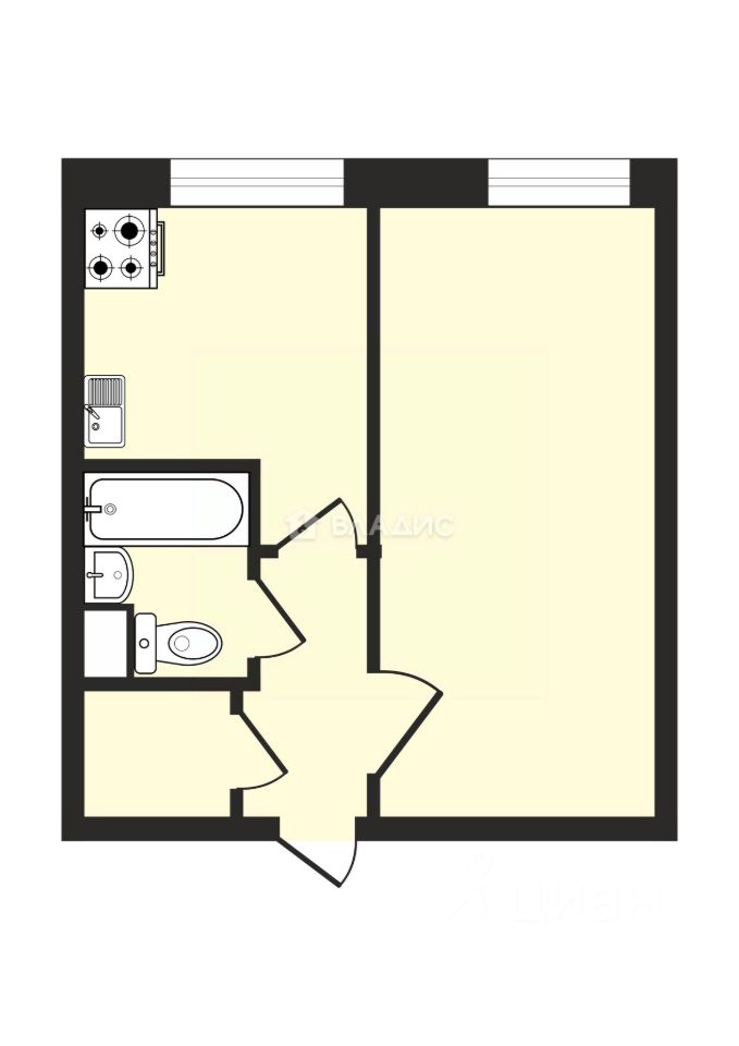 Квартира, общей площадью 28,8 кв.м., из которых: одна изолированная комната - 15,5 кв.м., кухня - 6,4 кв.м., коридор с вместительной кладовой или гардеробом, один совмещенный санузел.
