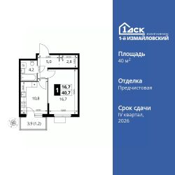 Продаётся 1-к квартира номер 351 общей площадью 40.7 кв.м. на 9-м этаже 12 этажного здания. Отделка Whitebox. Цена с учётом скидки.