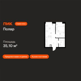 Продаётся 1-комн. квартира площадью 35,1 кв.м на 49 этаже 50 этажного дома (Корпус 1.5, Секция 2) проекта ПИК Полар. Светлый просторный подъезд на уровне земли, функциональная планировка, большие окна, предчистовая отделка.