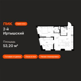 Продаётся 2-комн. квартира площадью 53,2 кв.м на 3 этаже 43 этажного дома (Корпус 1.1, Секция 1) проекта ПИК 2-й Иртышский. Светлый просторный подъезд на уровне земли, функциональная планировка, большие окна, c отделкой.