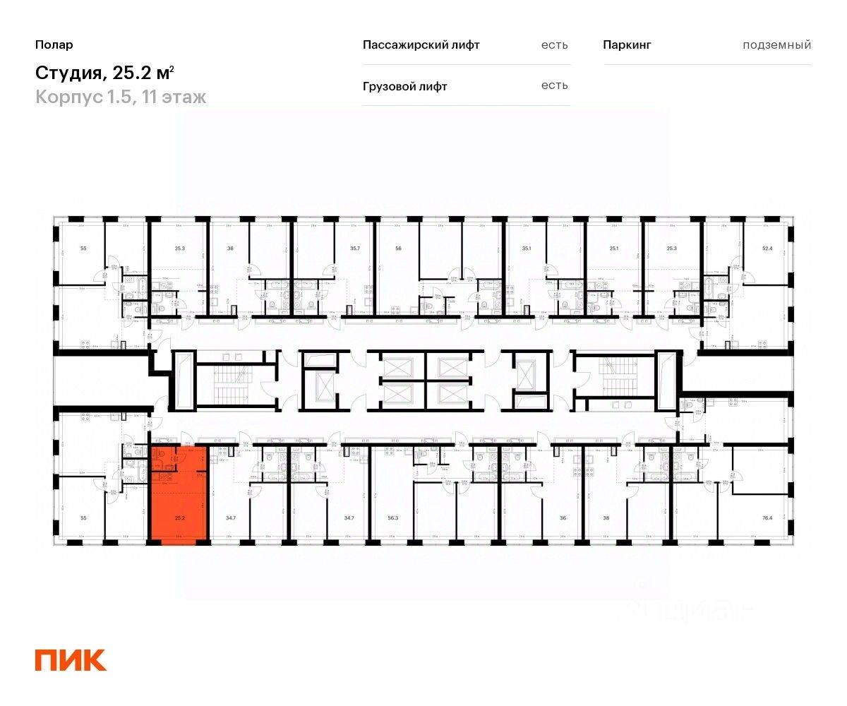 Продаётся квартира-студия площадью 25,2 кв.м на 11 этаже 50 этажного дома (Корпус 1.5, Секция 2) проекта ПИК Полар. Светлый просторный подъезд на уровне земли, функциональная планировка, большие окна, предчистовая отделка.