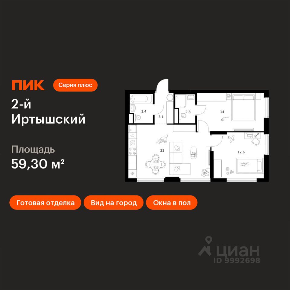 Продаётся 2-комн. квартира площадью 59,3 кв.м на 5 этаже 43 этажного дома (Корпус 1.1, Секция 1) проекта ПИК 2-й Иртышский. Светлый просторный подъезд на уровне земли, функциональная планировка, большие окна, c отделкой.