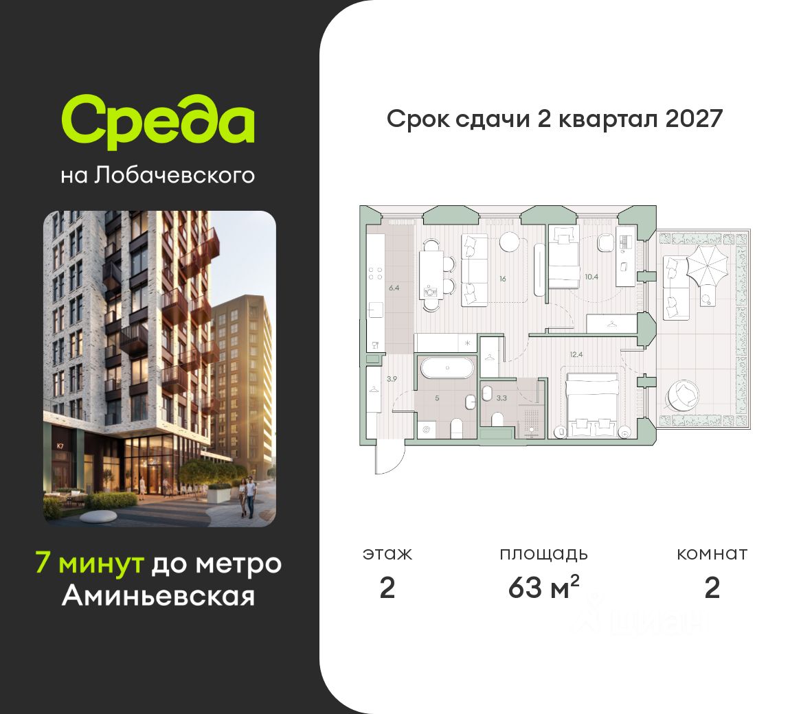 Продаётся 2-комнатная квартира общей площадью 63 кв.м. с отделкой white box. Квартира расположена на 2 этаже корпуса 5.2 в жилом комплексе бизнес-класса "Среда на Лобачевского" в пешей доступности от метро "Аминьевская".