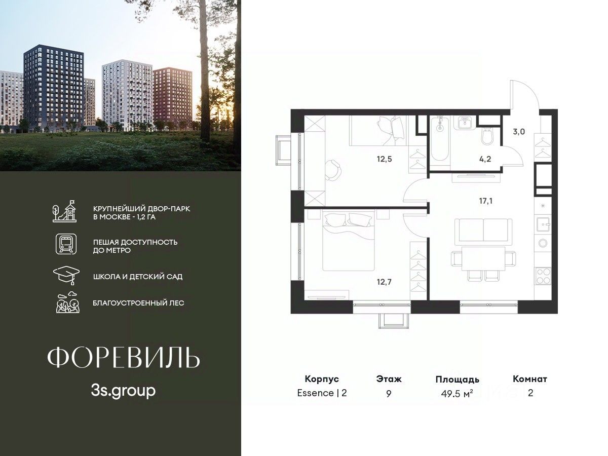 Предчистовая отделка в подарок! Пешая доступность от метро и московская прописка! Продается уютная 2-комн. квартира площадью 49,5 кв.м на 9 этаже 17 этажного жилого комплекса бизнес-класса Foreville от 3S Group.