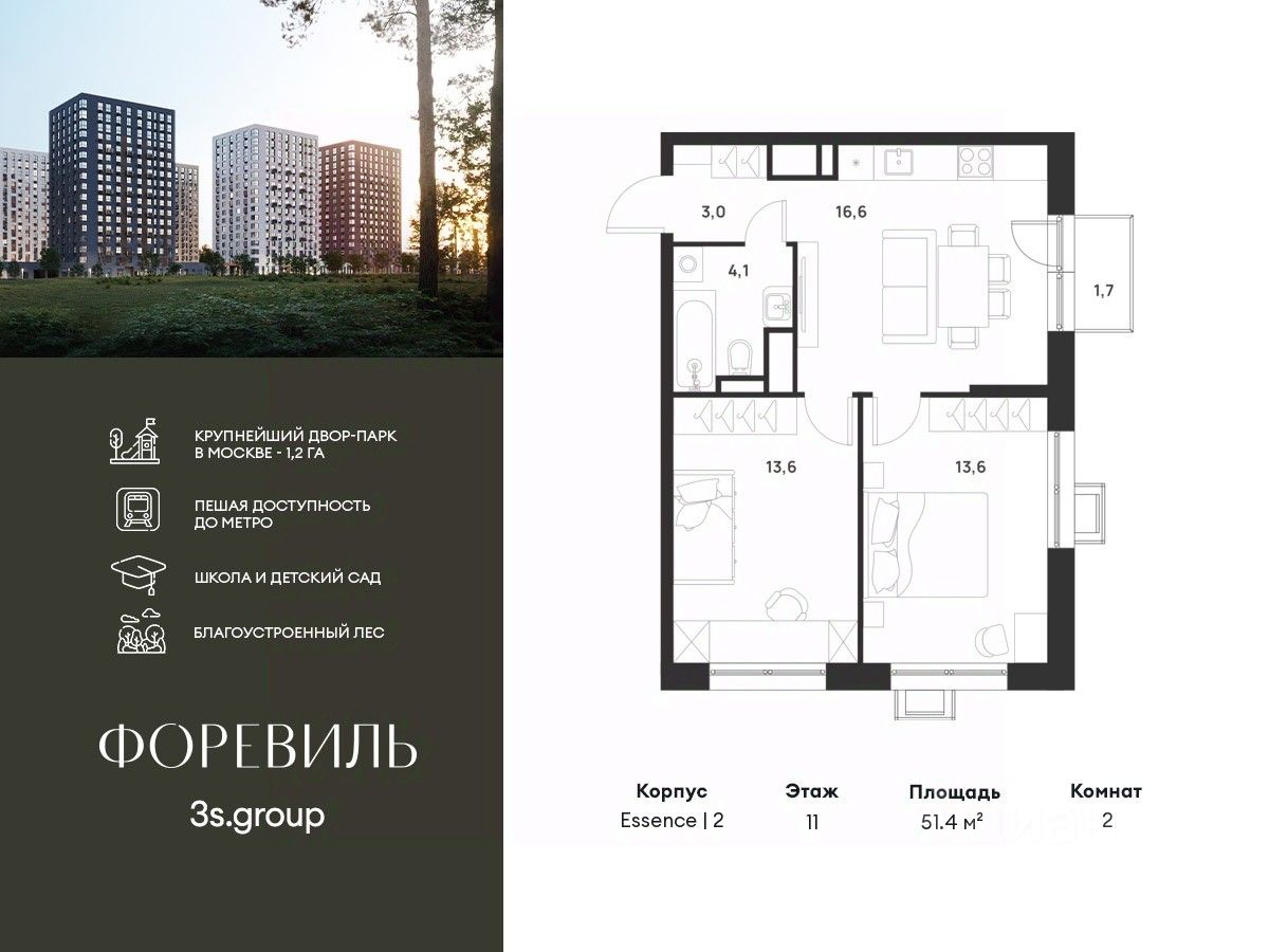 Предчистовая отделка в подарок! Пешая доступность от метро и московская прописка! Продается уютная 2-комн. квартира площадью 51,4 кв.м на 11 этаже 17 этажного жилого комплекса бизнес-класса Foreville от 3S Group.