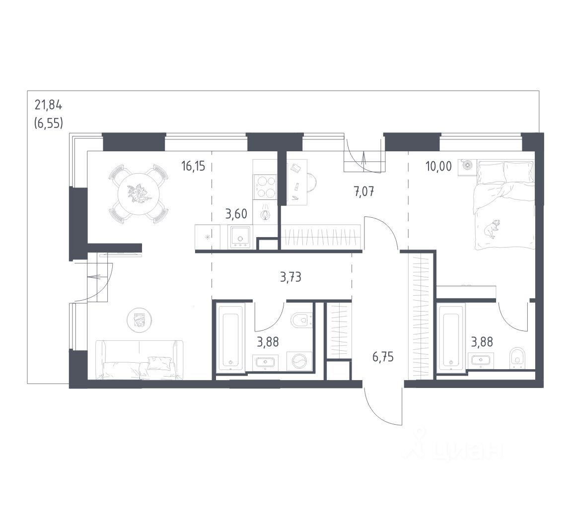 Вы можете сразу заказать мебель, технику, декор и текстиль. Уникальный интерьер подчеркнет ваш вкус. Для тех, кто хочет самостоятельно обустроить пространство с нуля, возможна сдача помещения без отделки.