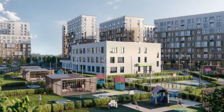 Жилой комплекс в окружении лесопарков и рядом с рекой. До станции МЦД-4 "Санино" можно дойти пешком за 7 минут, а на территории проекта появится транспортно-пересадочный узел с торговым центром. Для жителей построят школу, 2 детсада, в одном из которых будут развивающие кабинеты-трансформеры.